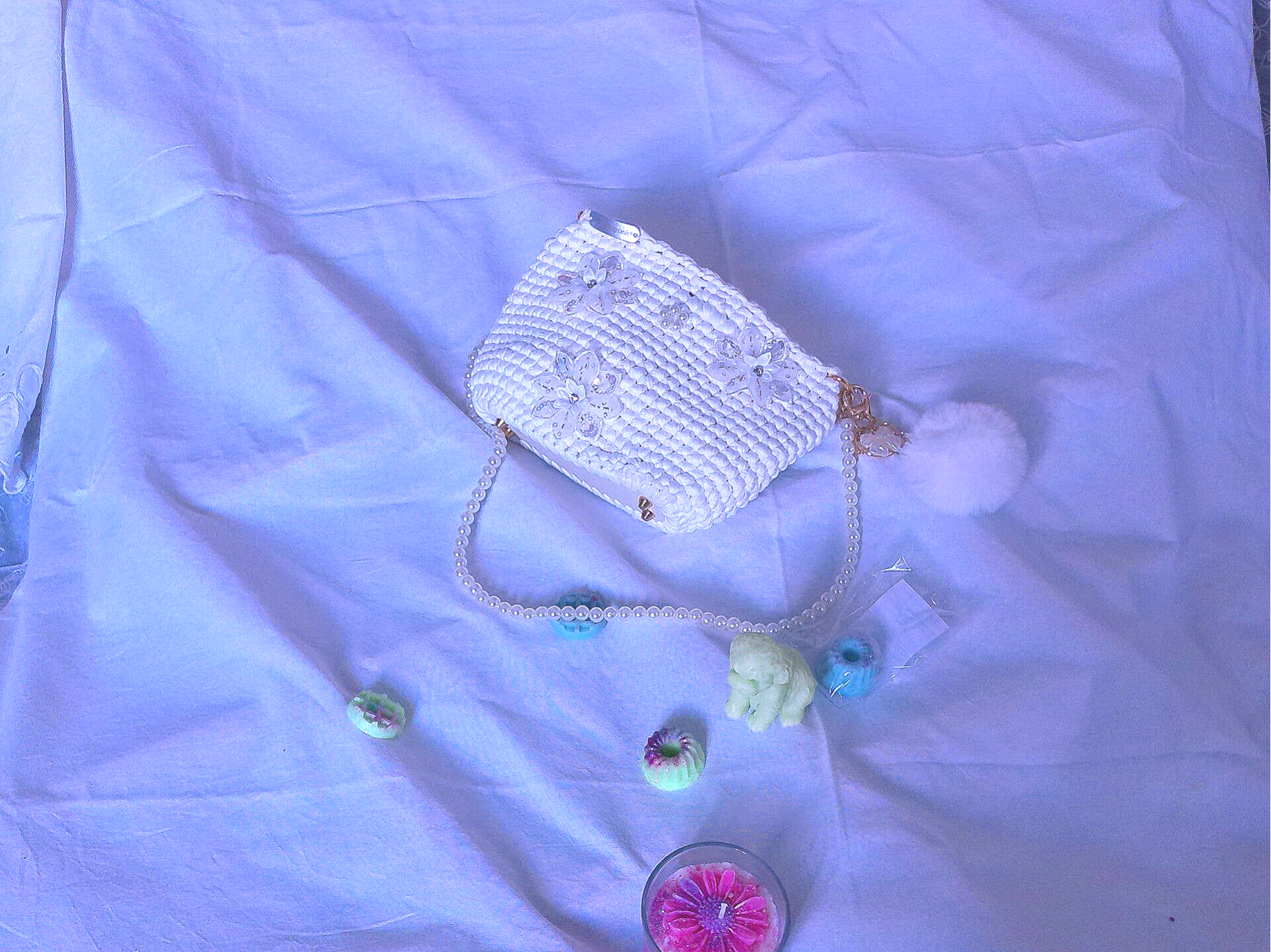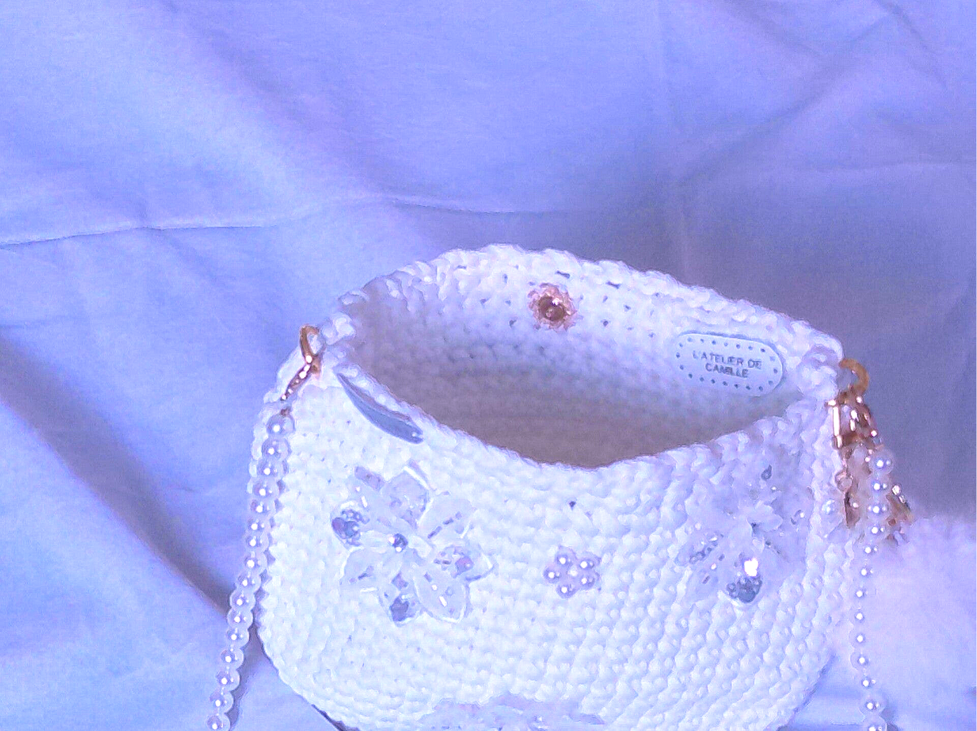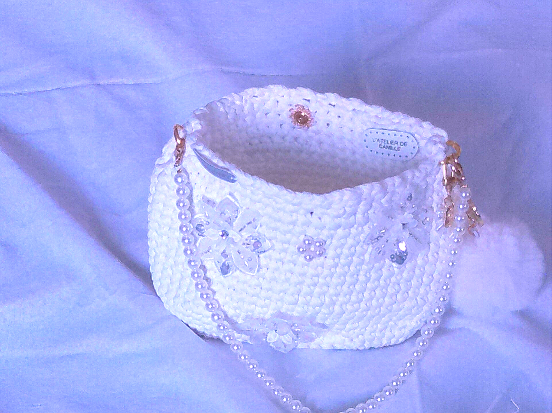 Habillage : anse perle 65cm, pompon, porte clé.