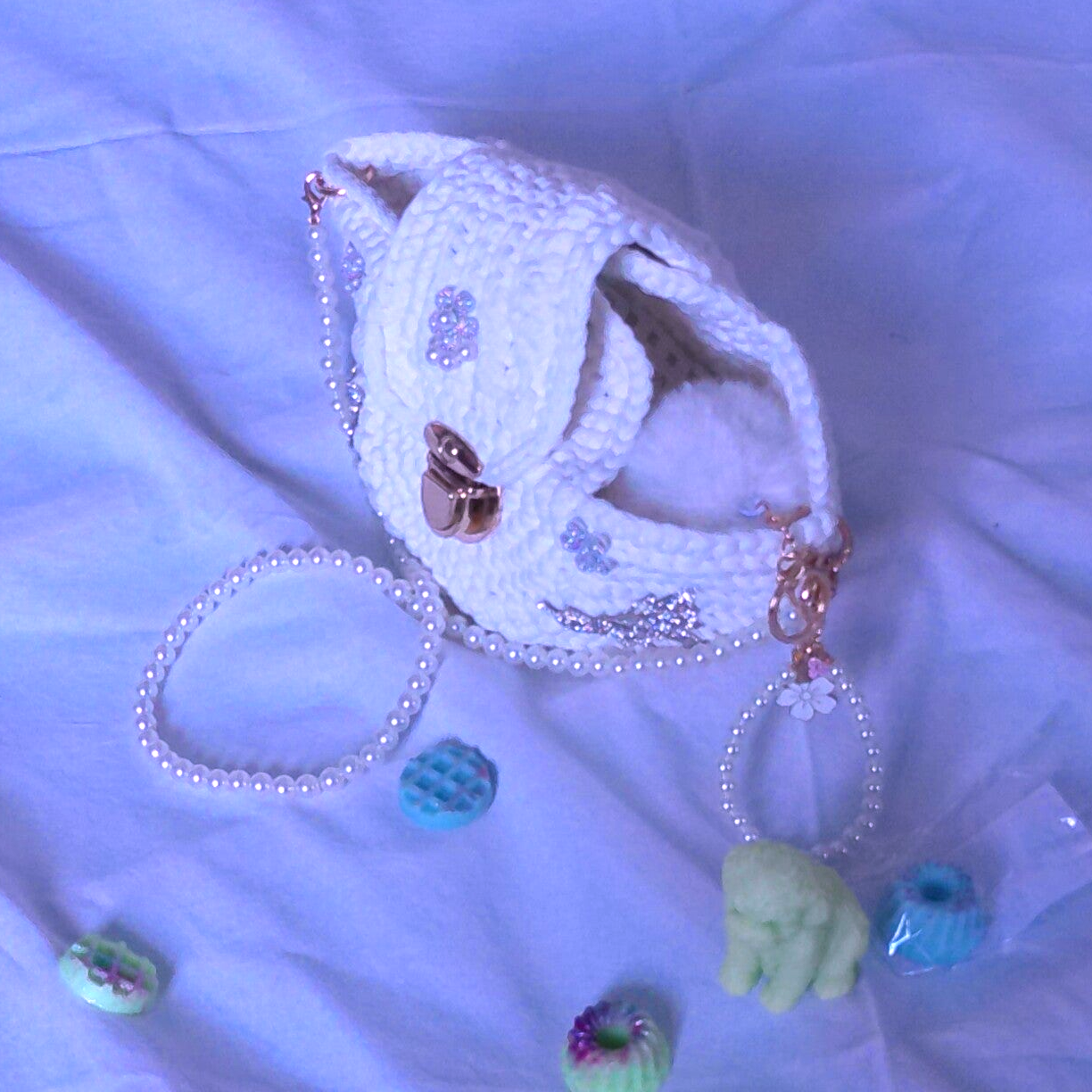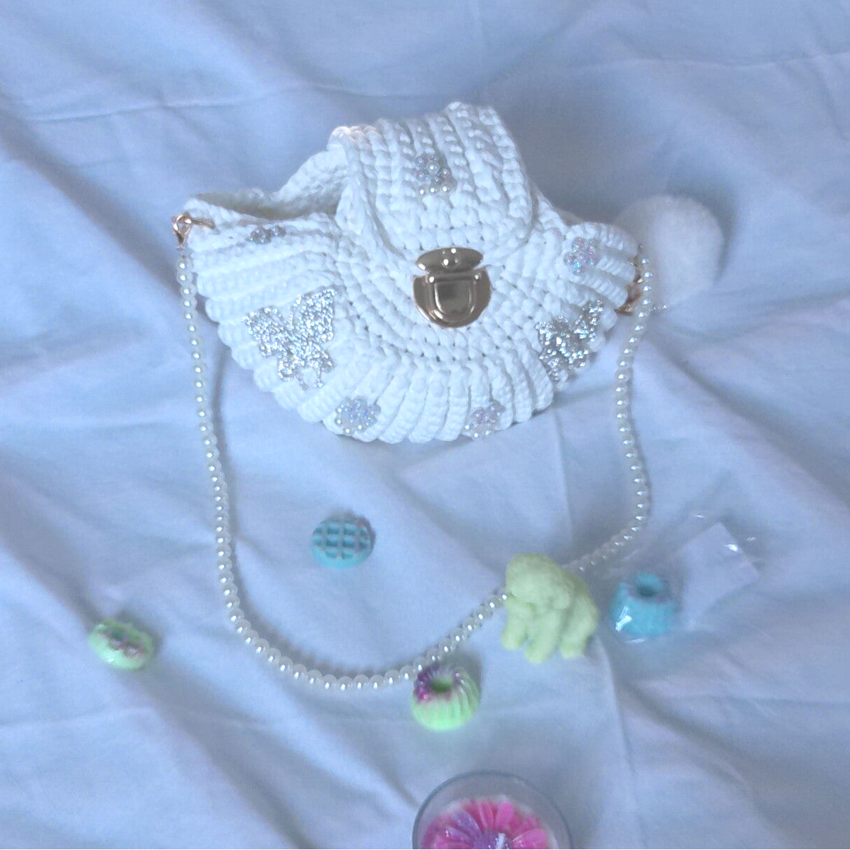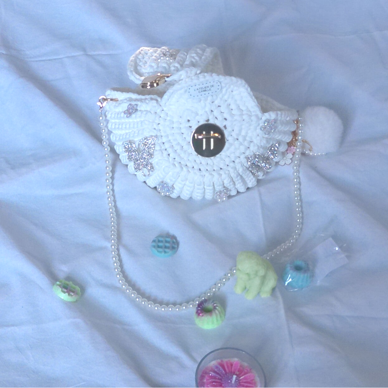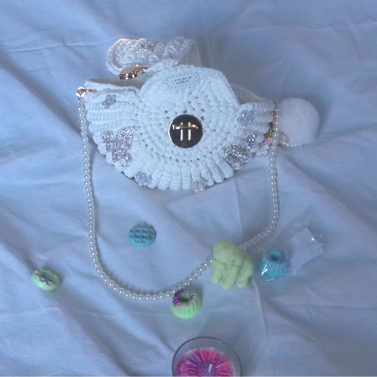 Habillage : anse perle, pompon, porte clé, grosse boucle strass papillon