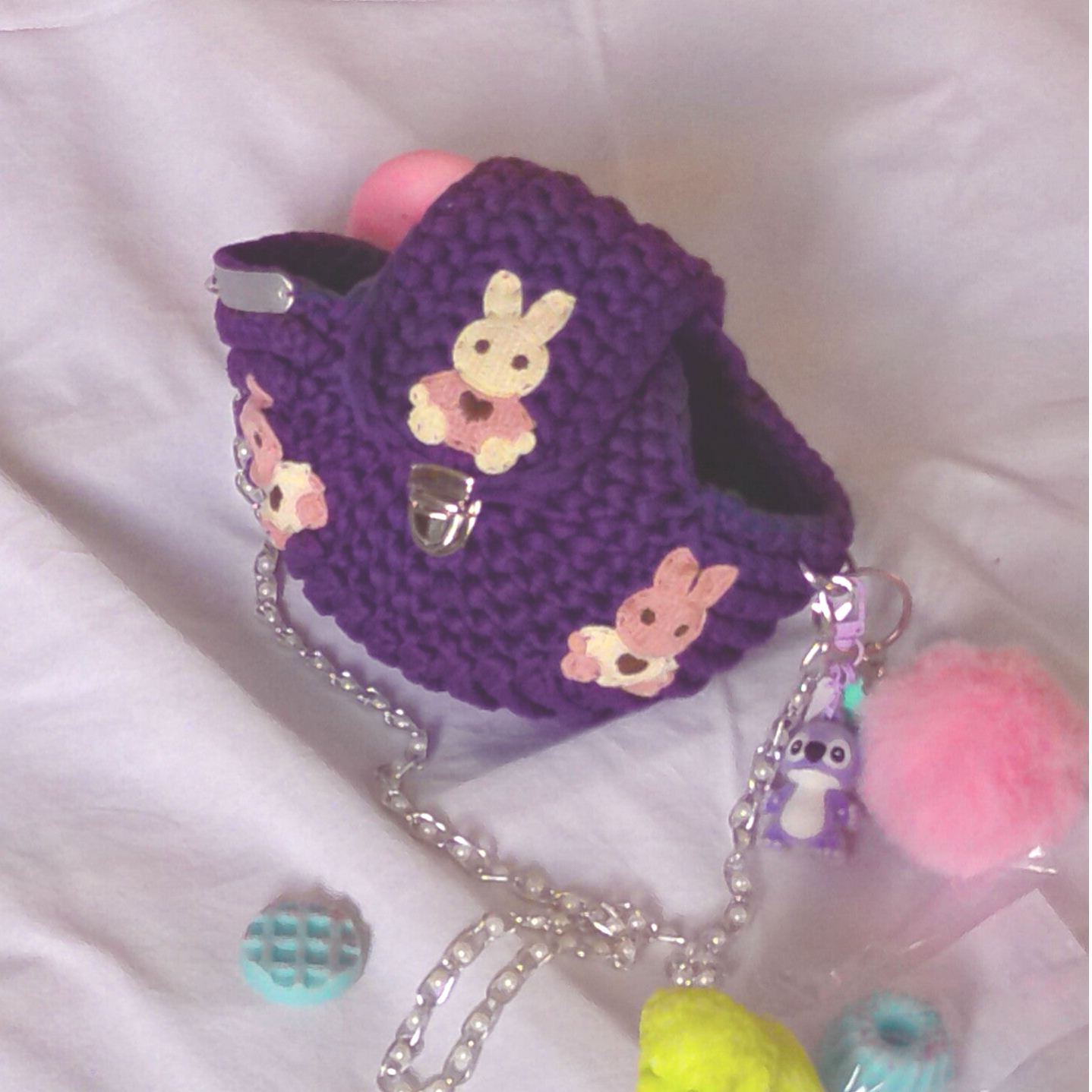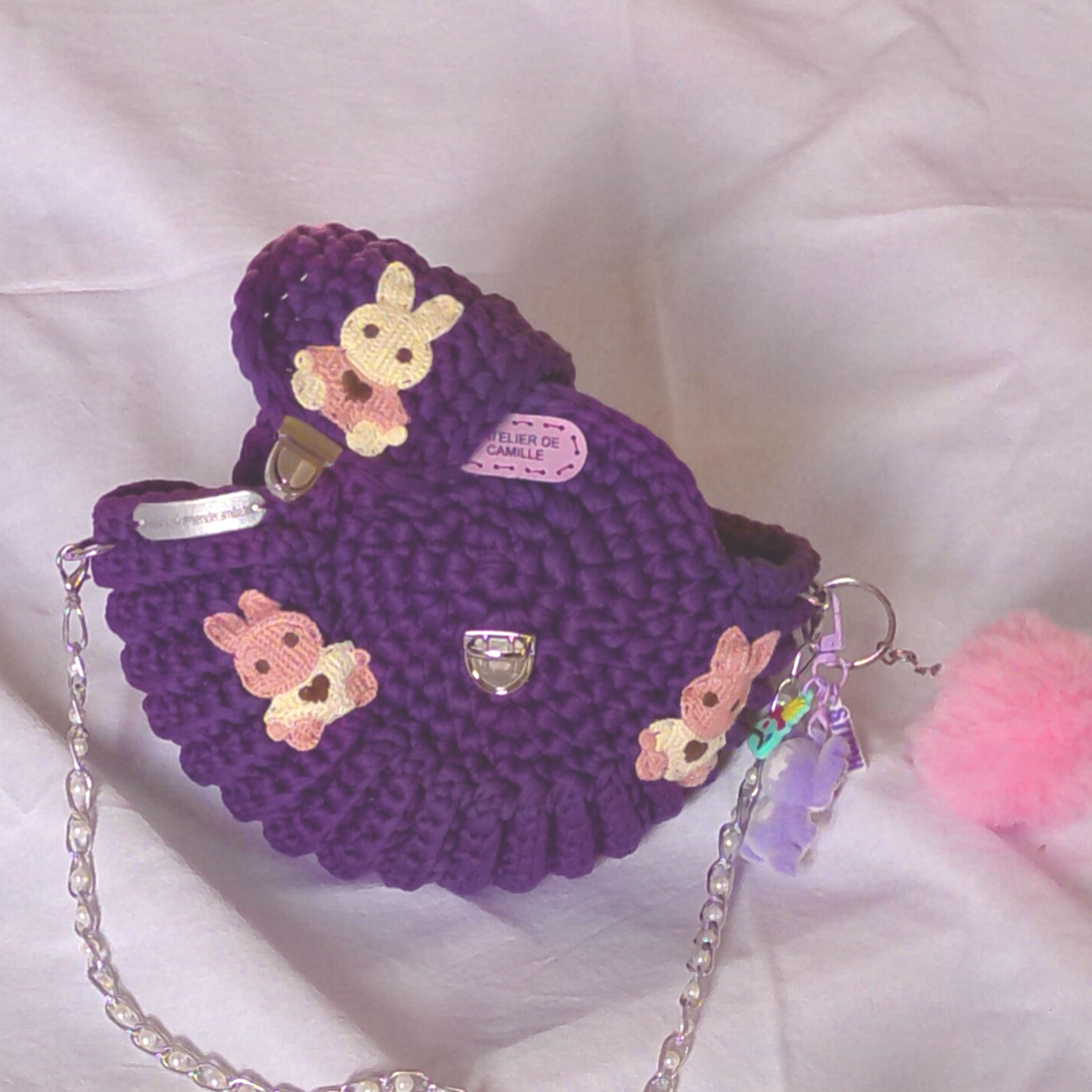 Habillage : anse chaine argenté, pompon, porte clé,