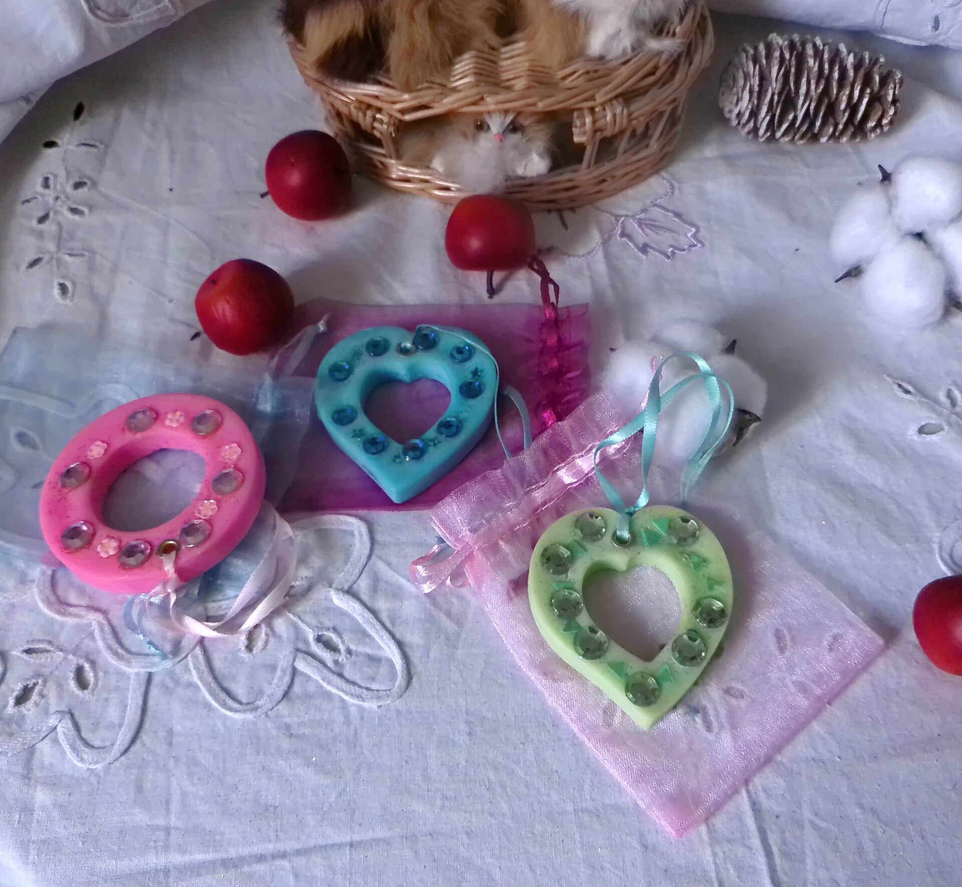 La cire de soja a été utilisé pour la fabrication des pendants avec le parfum Monoï des Iles de Grasse en France.