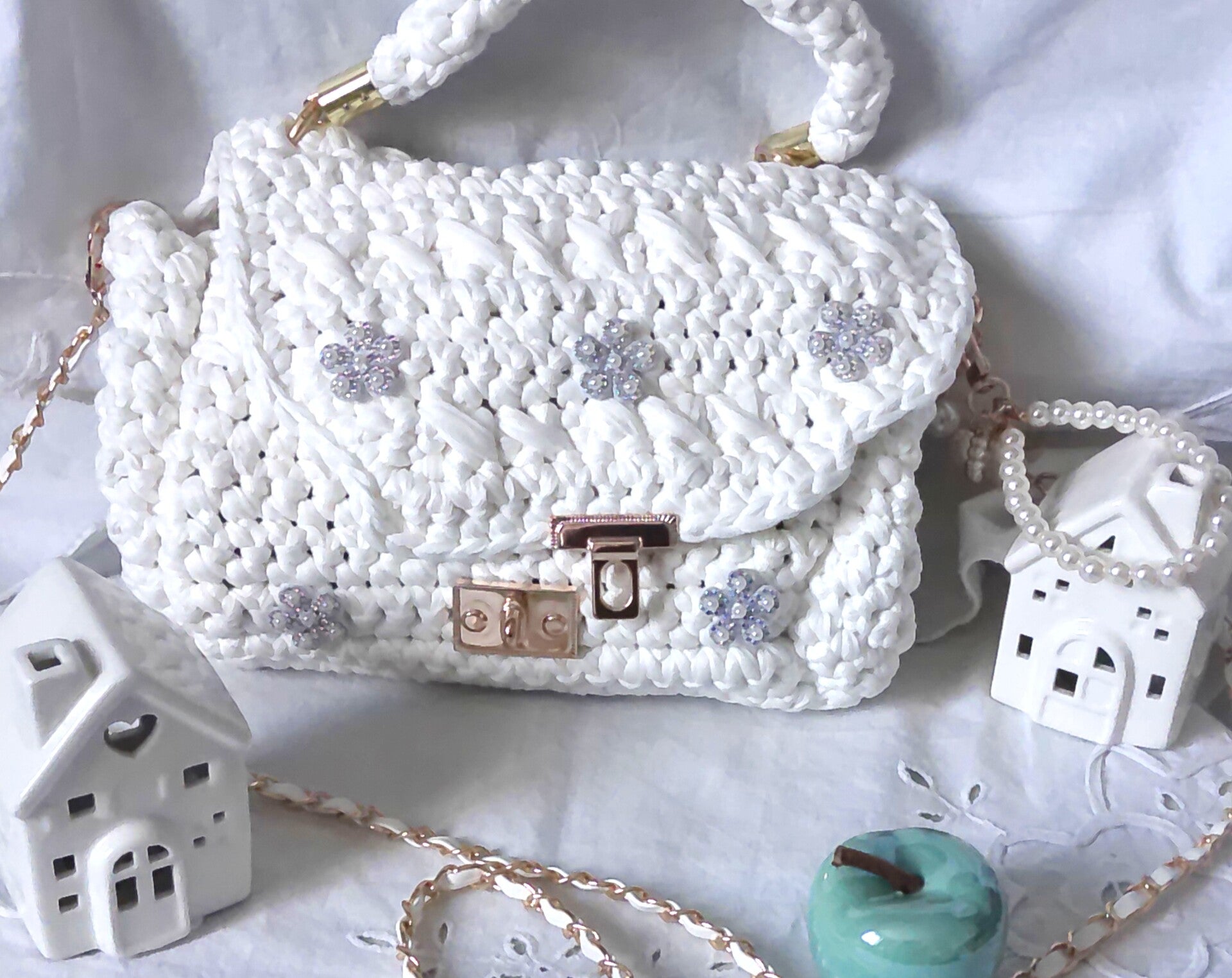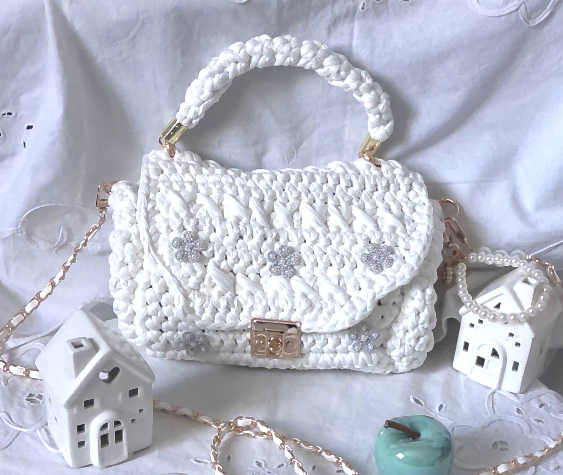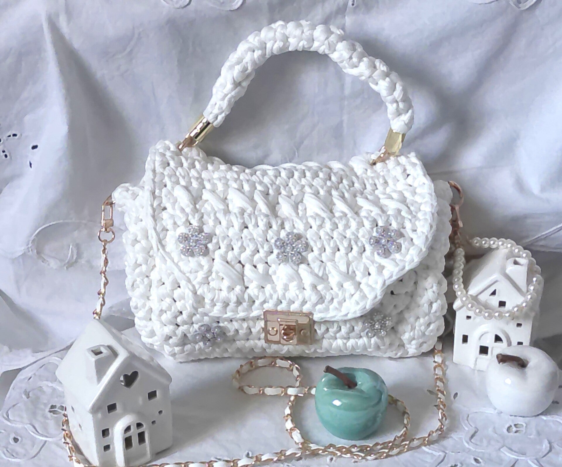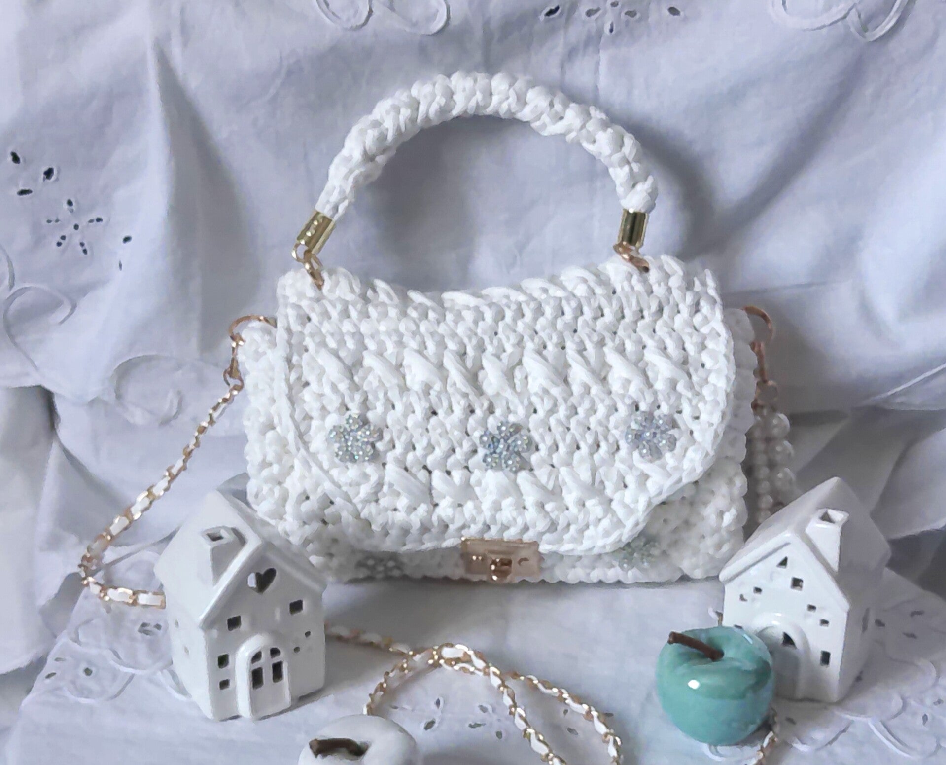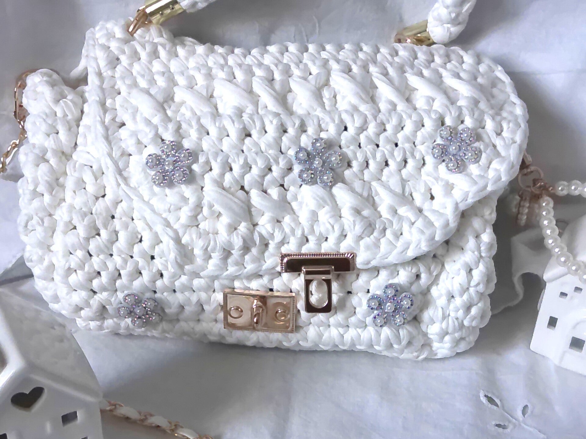 Habillage poirgnée ronde, anse doré blanche, porte clé, patcht brillant.