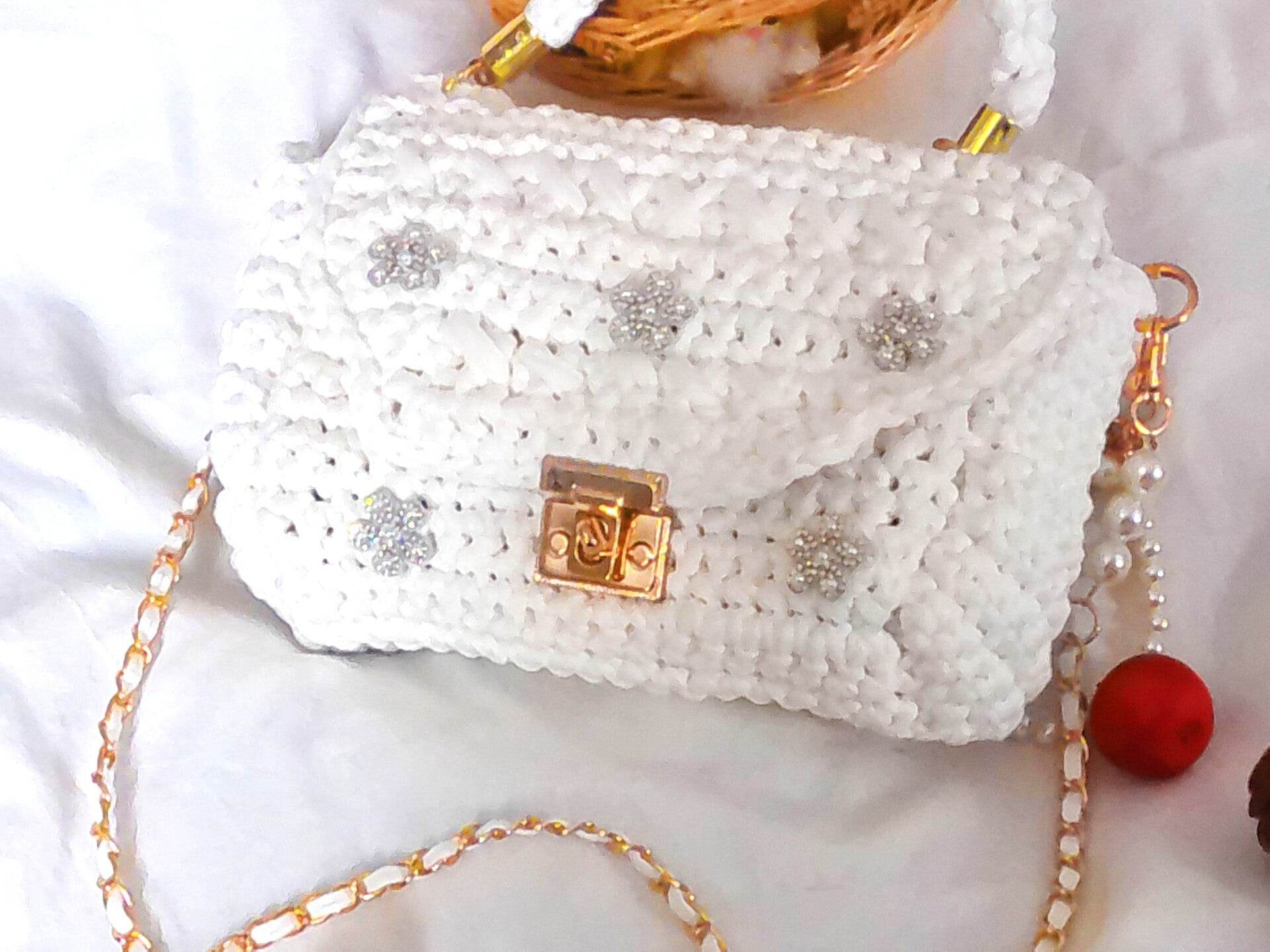 Habillage poirgnée ronde, anse doré blanche, porte clé, patcht brillant.