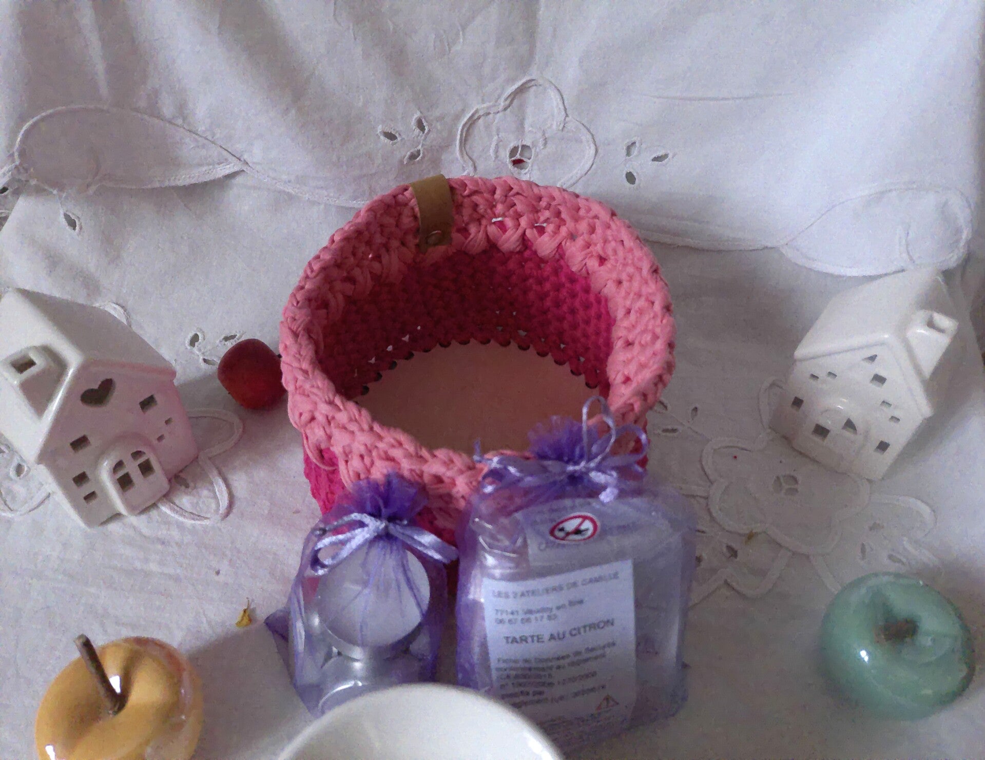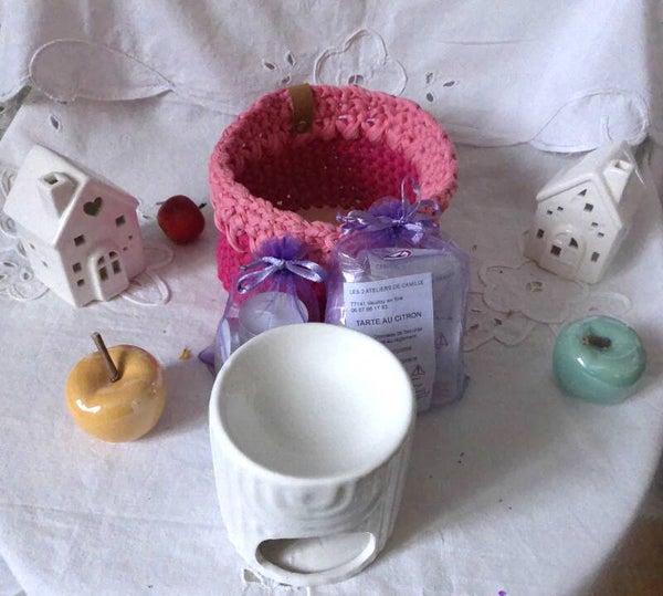 Panier avec 1 bruleur, 5 bougies chauffe plat et 4 fondants parfumés,  original , organisateur pour stoker des fondant parfumés ou dun materiel à  crochet ou bijoux .