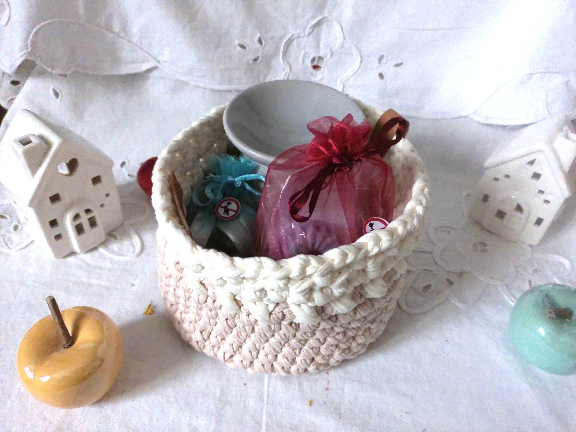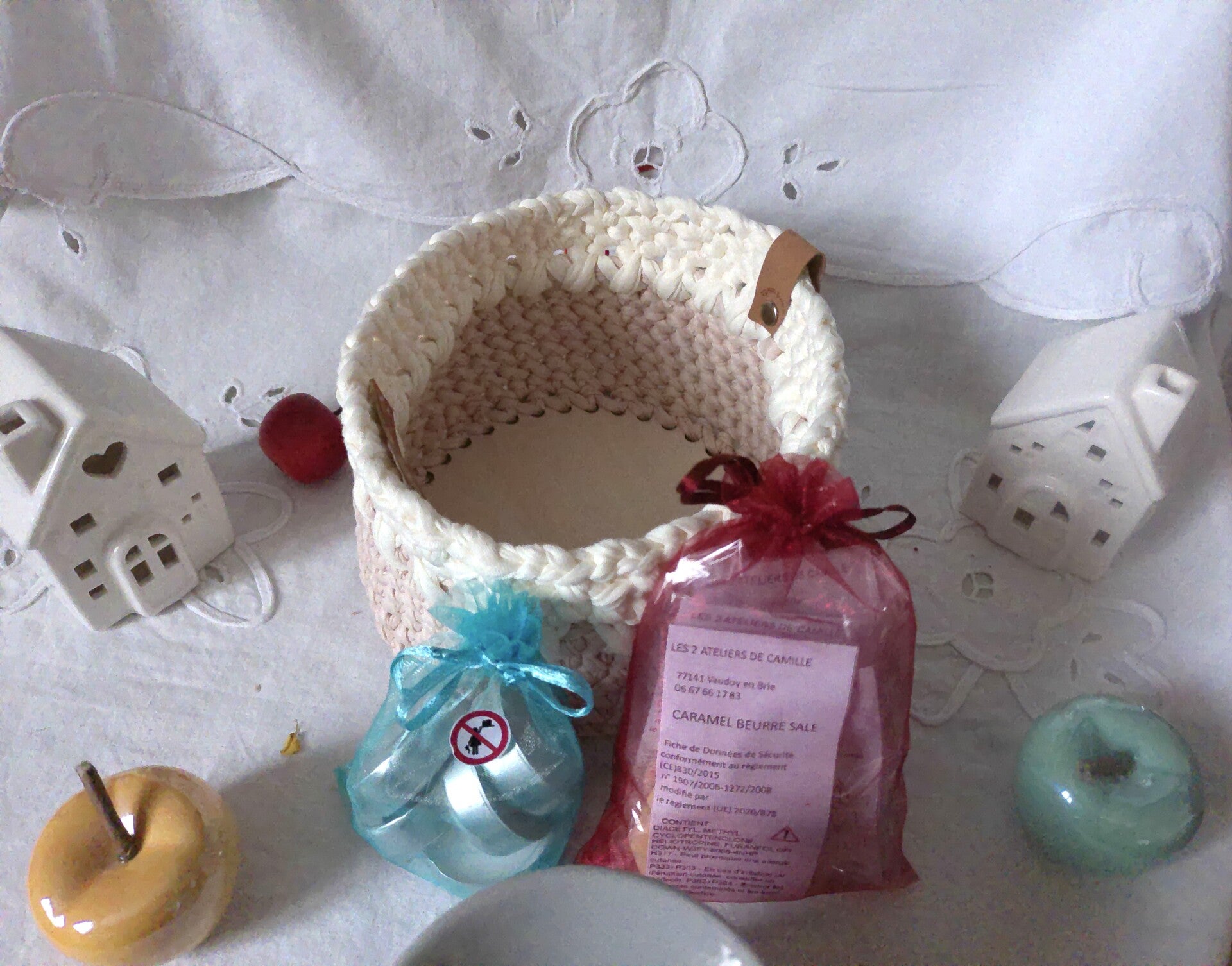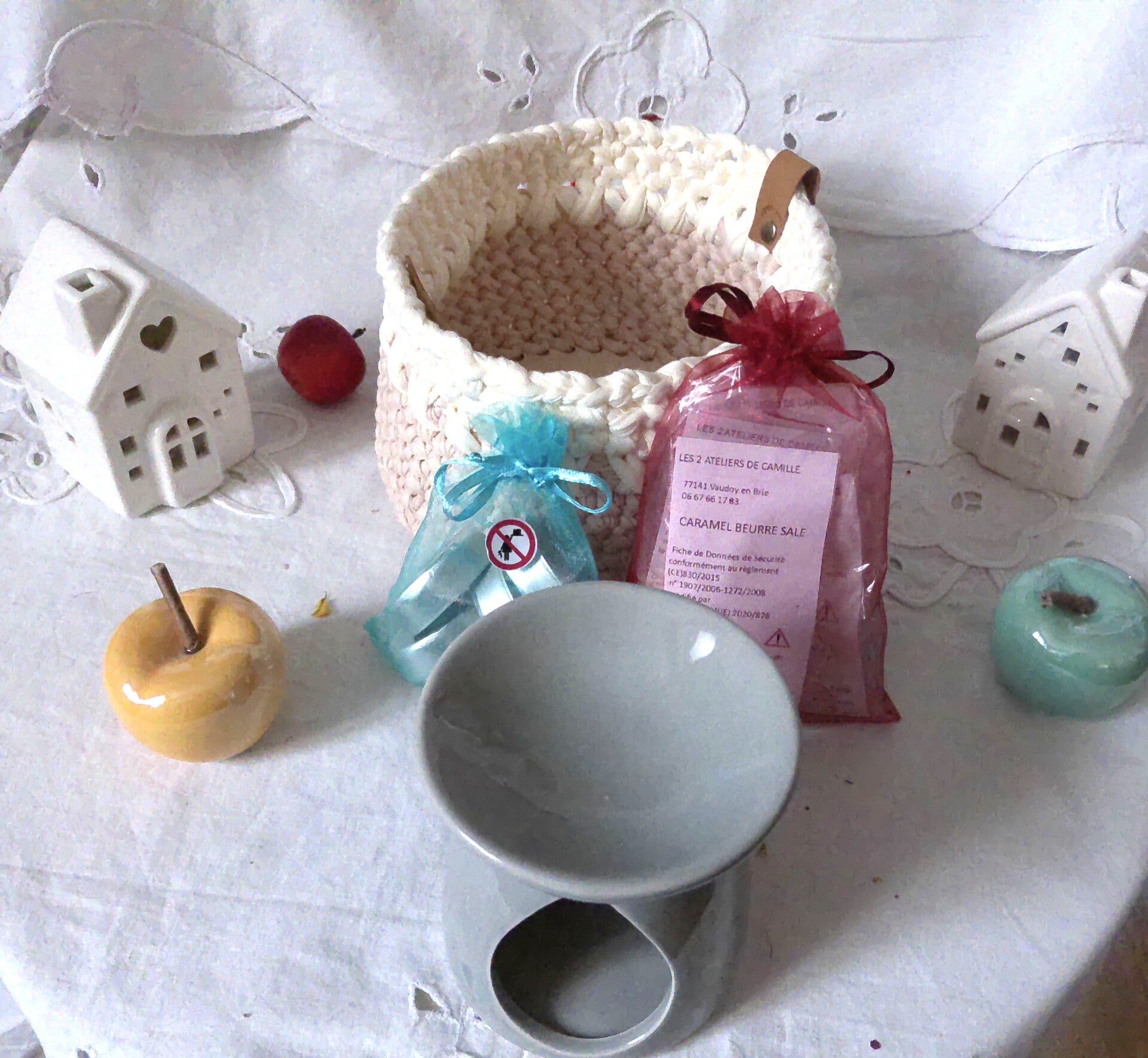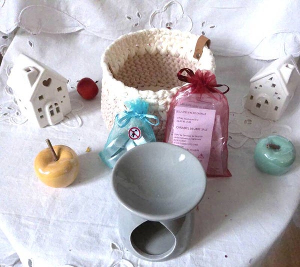 Panier avec 1 bruleur, 5 bougies chauffe plat et 4 fondants parfumés, original , organisateur pour stoker des fondant parfumés ou dun materiel à crochet ou bijoux .