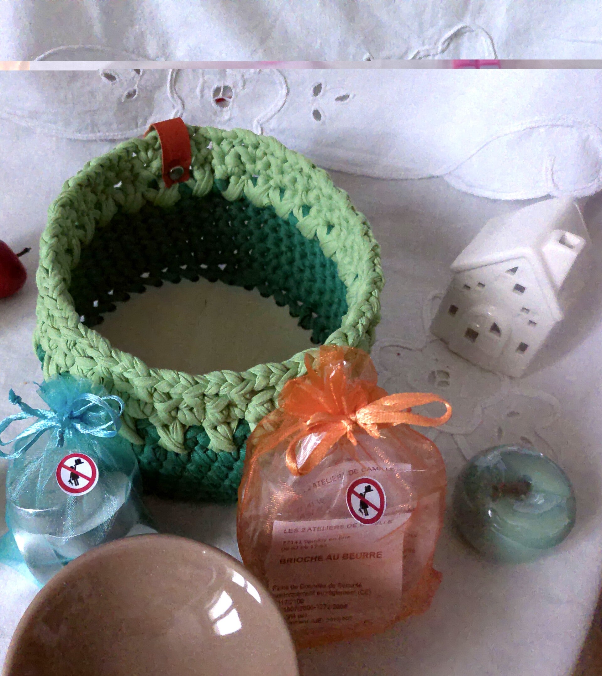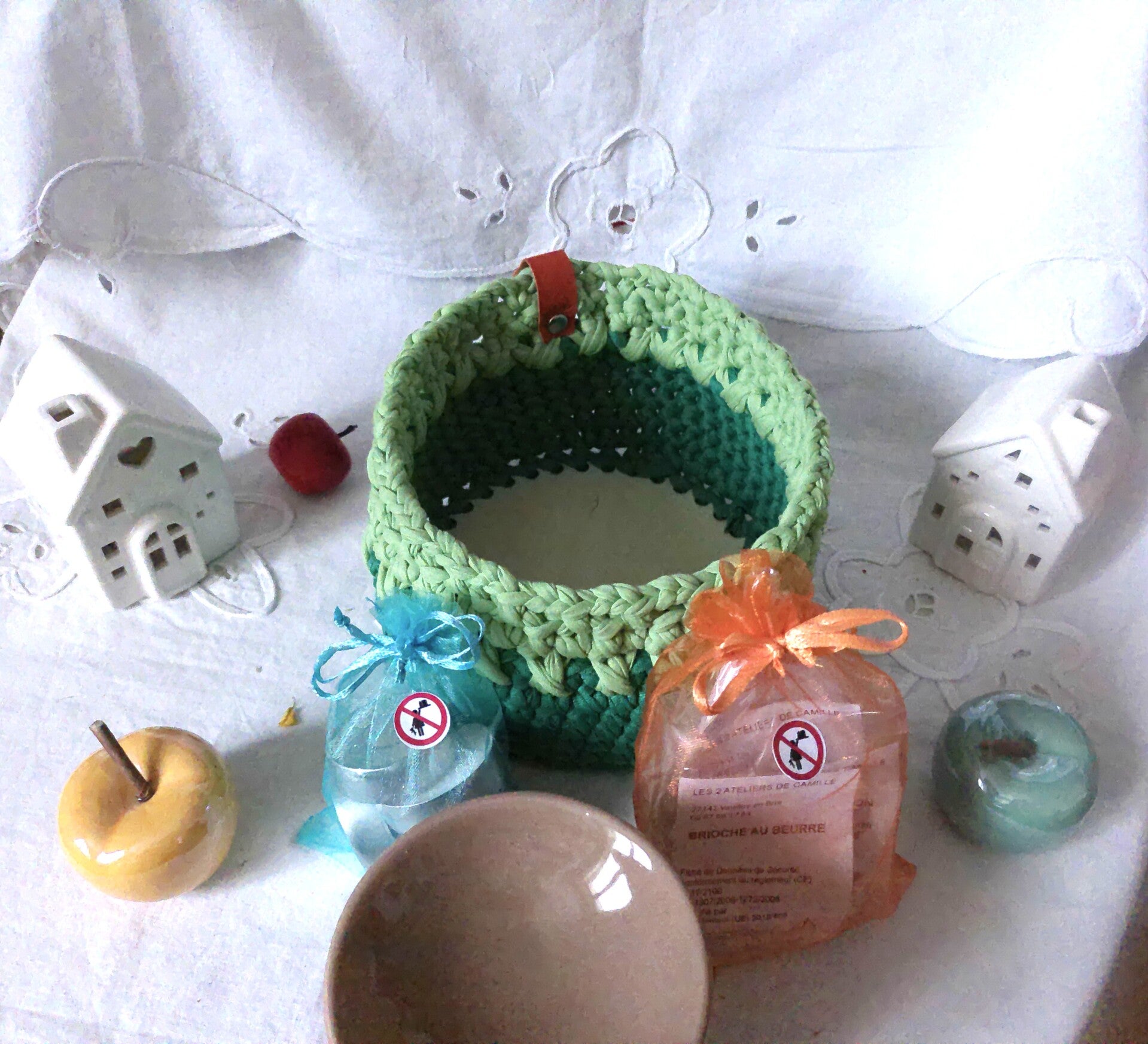 Panier avec 1 bruleur, 5 bougies chauffe plat et 4 fondants parfumés, original , organisateur pour stoker des fondant parfumés ou dun materiel à crochet ou bijoux .
